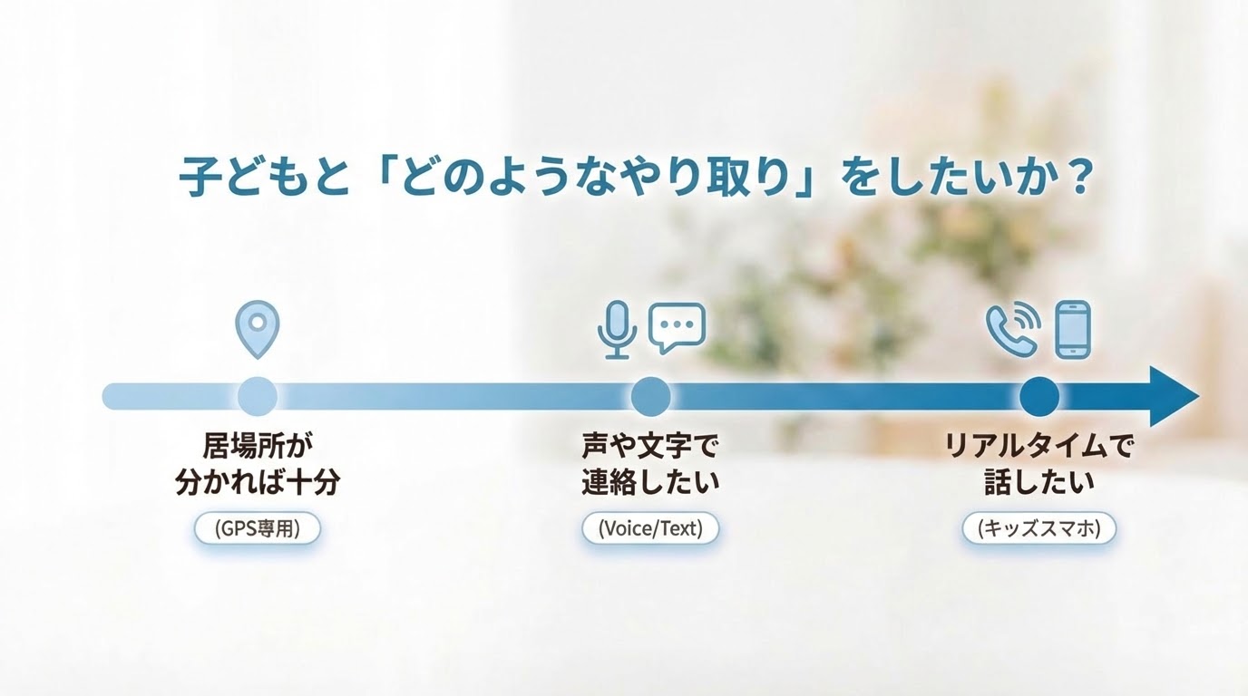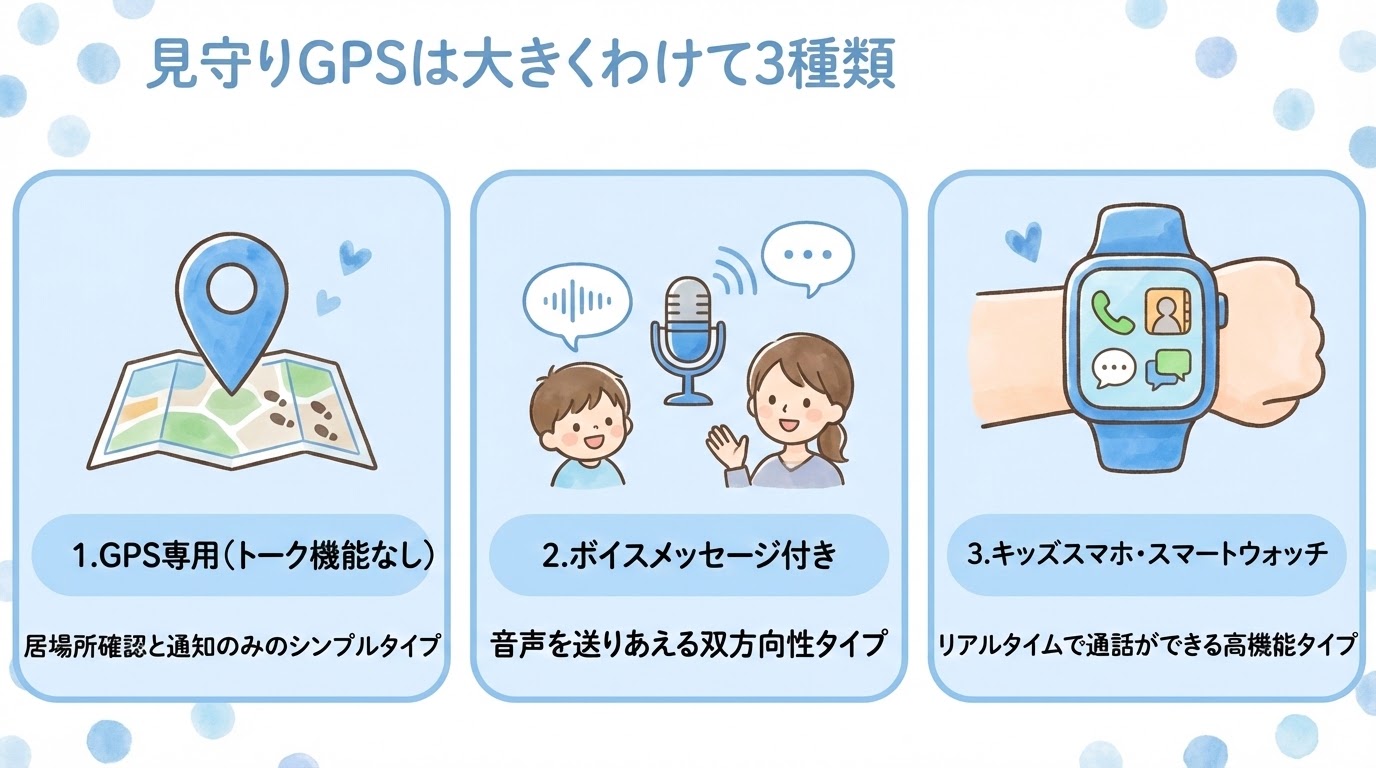 子供用GPSは、備わっている機能によって大きく以下の3つのタイプに分けられます。まずは大まかな方向性を把握しましょう。