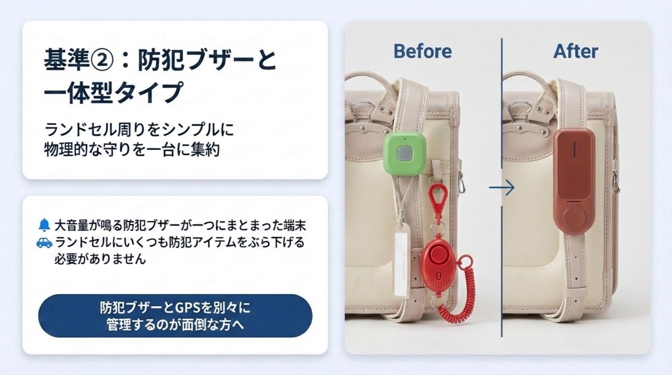 「防犯ブザーとGPSを別々に持たせるのが面倒」「いざという時に、周囲に危険を知らせる手段を物理的に持たせておきたい」という方におすすめします。